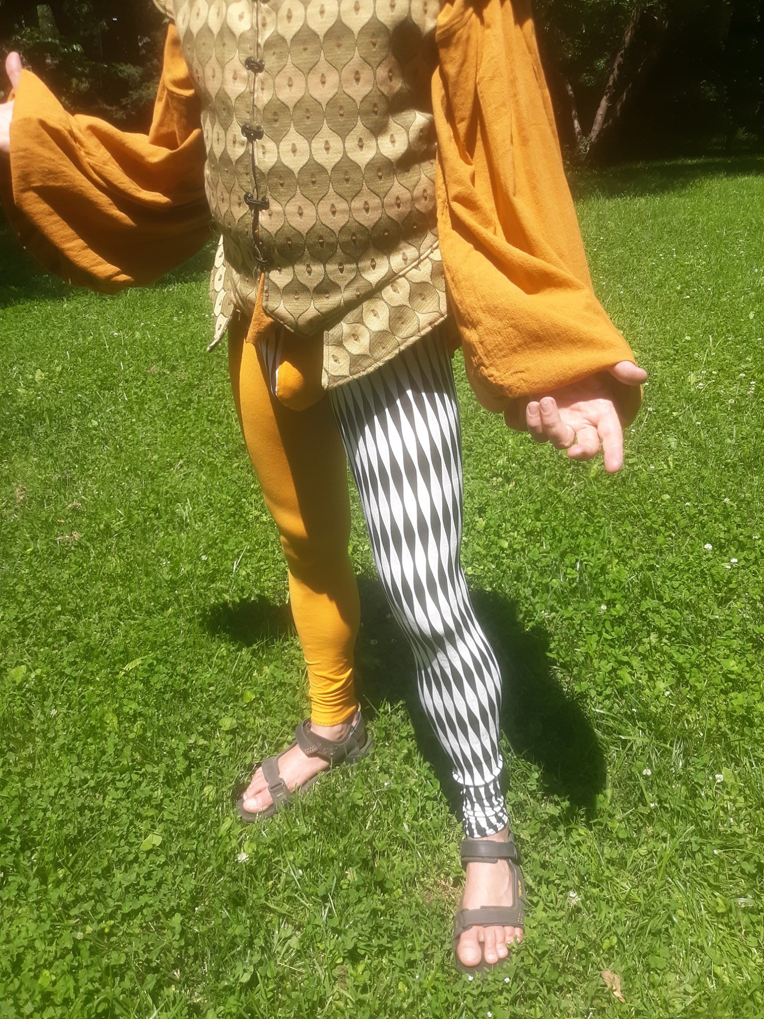NOTES ON AVAILABLE STOCK DURING OUR TIME OFF: During his sabbatical, the only tights available are from already made stock. That means, regular size ONLY, with one color leg and one black leg. No custom orders for the indefinite future. Tights of two colors, all one color, or all black are NOT available at this time. We apologize.